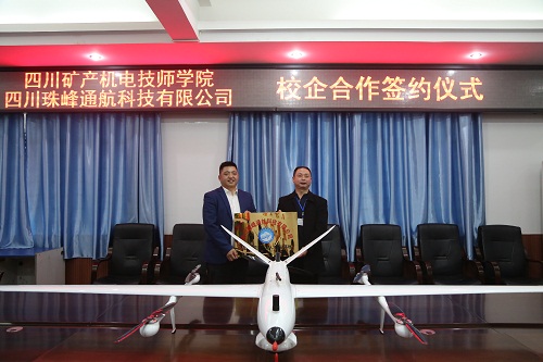 学院副院长董维代表学院与四川珠峰通航科技有限公司签署了校企合作协议,同时双方还互相授牌建立无人机教学实训、考证培训基地。